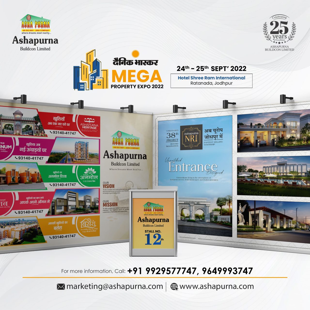 The two-day Dainik Bhaskar Mega Property Expo-2022 was organized on 24 & 25 September 2022. The Mega Property Expo began on the 24 & 25 September 2022 Saturday at Hotel Shre Ram Excellency, Ratanada, Jodhpur. A large number of visitors attended the expo on the very first day itself. The expo will offer a plethora of property options to the customers under one roof. Ashapurna Buildcon has also participated in the Danik Bhaskar real estate expo 2022 and grabbed all the customer’s attention with their luxurious projects at prime locations in Rajasthan.